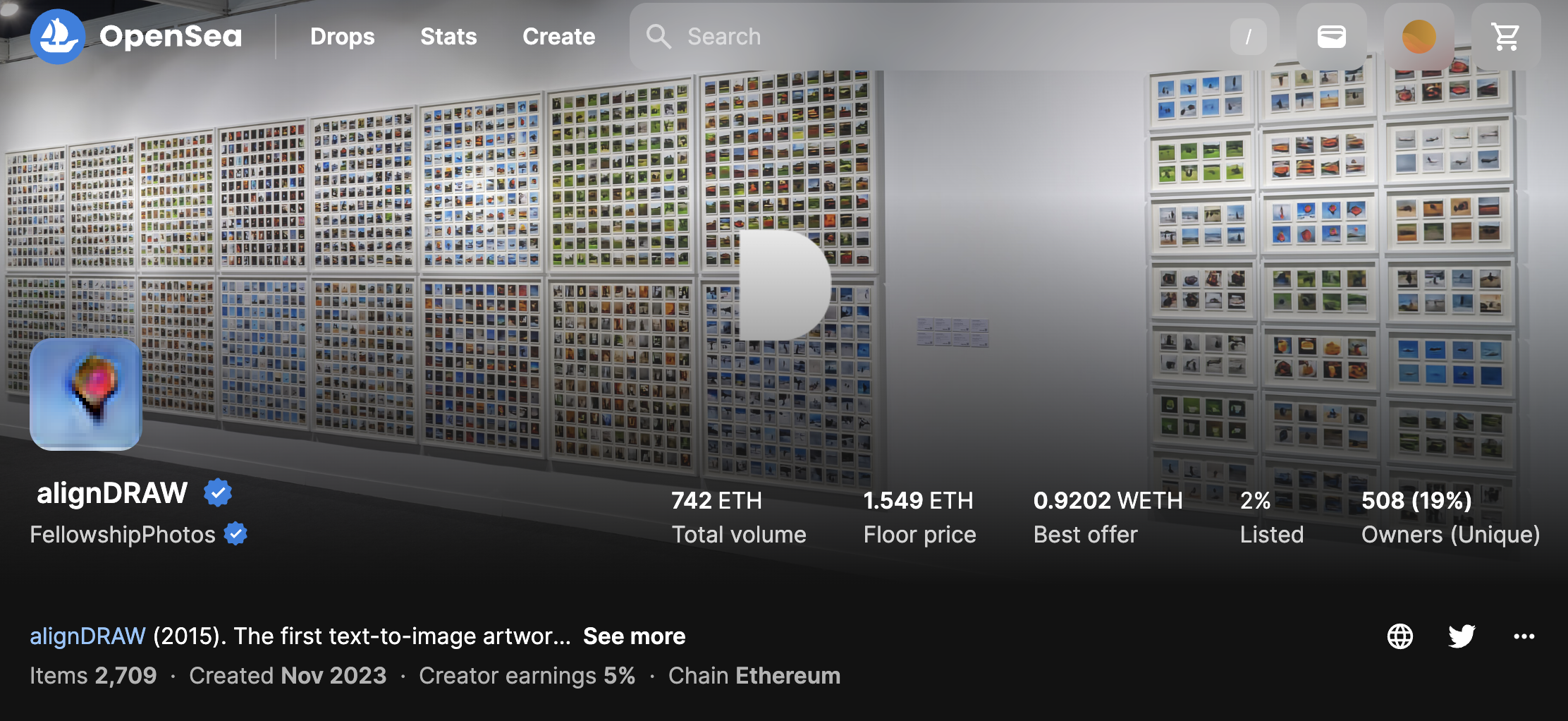 The digital versions of the alignDRAW generated images (NFTs) have been fully minted out (floor price of 0.1 ETH at the time of the mint in December 2023) and are available on OpenSea and other major NFT platforms.